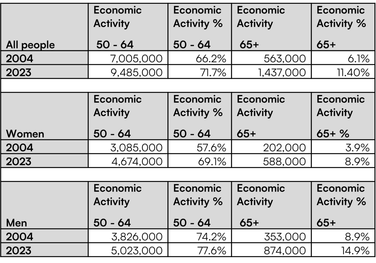 Join in the discussion on National Older Workers Week using #NOWW2024 As the report states the proportion of women aged 50 to 64 who were economically active increased from 57.6% in 2004 to 69% in 2023. For men, the increase was slightly smaller, from 74.2% in 2004 to 77.6% in 2023. Among people aged 65 and over, the relative increase has been even greater: the proportion of women aged 65 and over who were economically active more than doubled between 2004 and 2023, increasing from 4% to 8.9%.